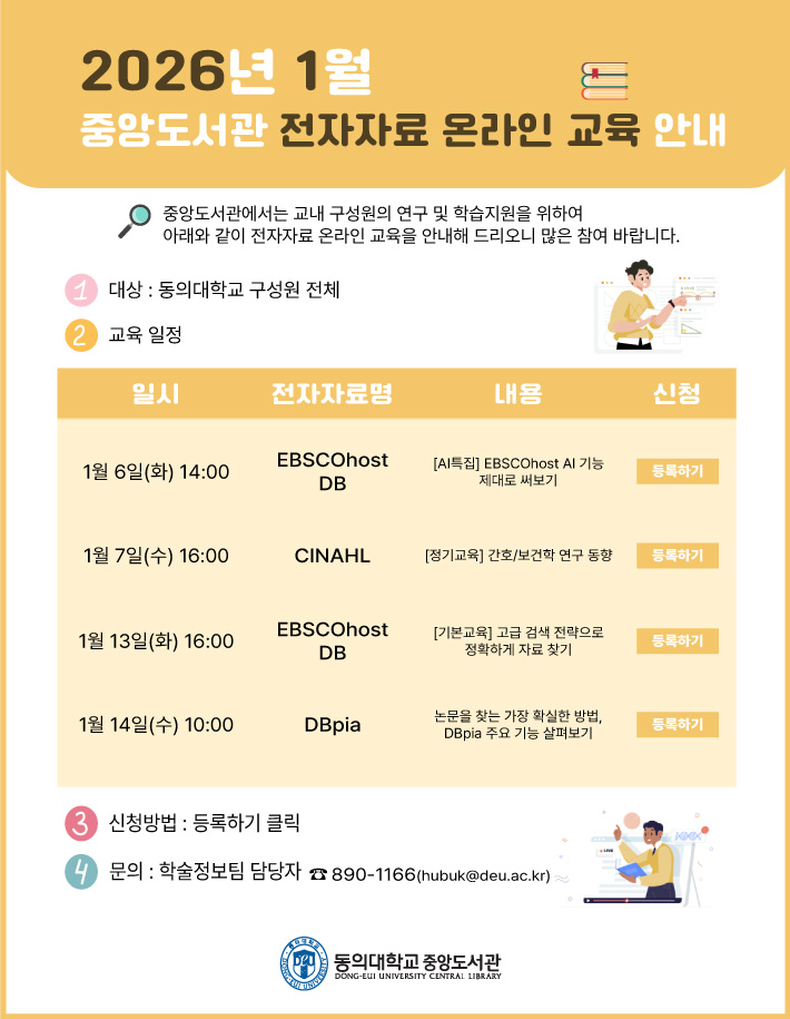 중앙도서관에서는 교내 구성원의 연구 및 학습지원을 위하여 1월 전자자료 온라인 교육을 다음과 같이 안내해 드리오니 많은 참여 바랍니다.